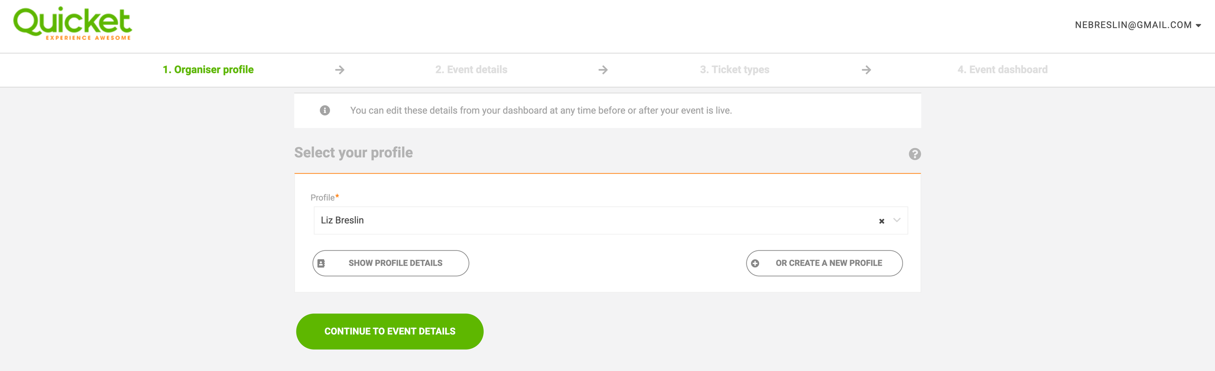 The section “Organiser Profile” was under “Event Details” in the old event creation process, but I realized this didn’t make hierarchical sense. Organizer profiles act as a brand or company, where organizers can group multiple events under one profile. Because of this, it made more sense for organizers to create or select a profile before adding event details.
