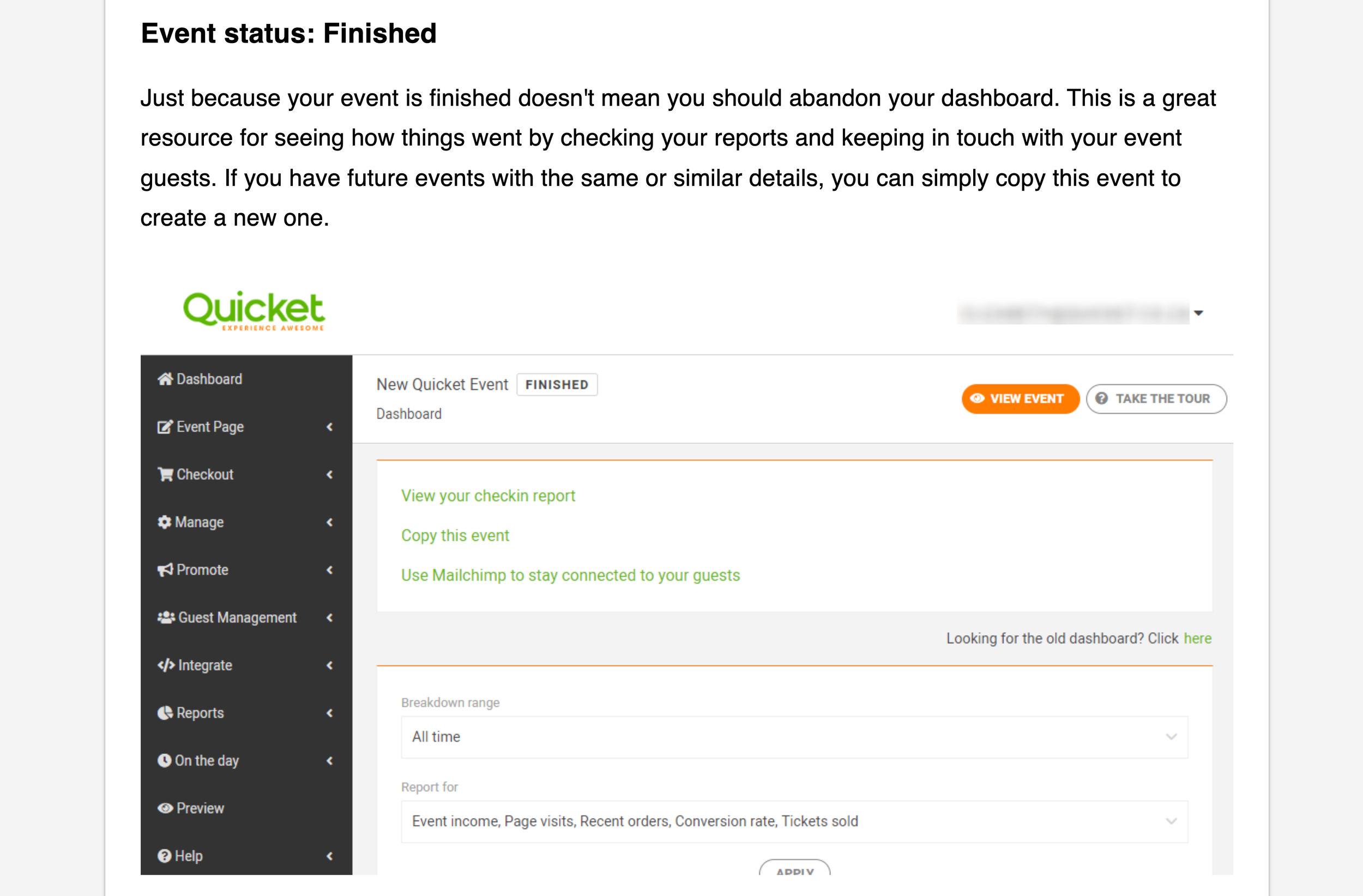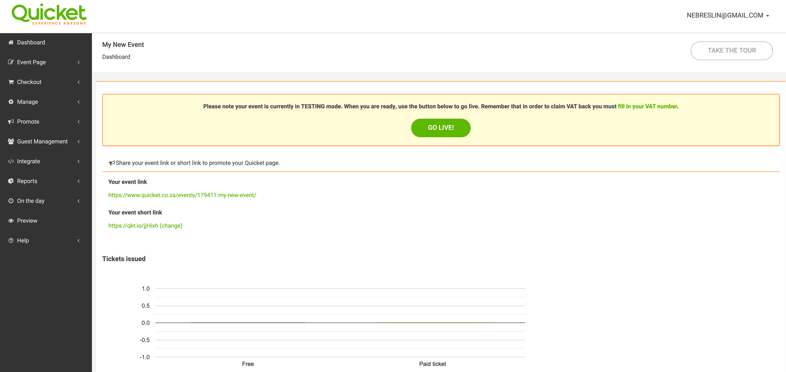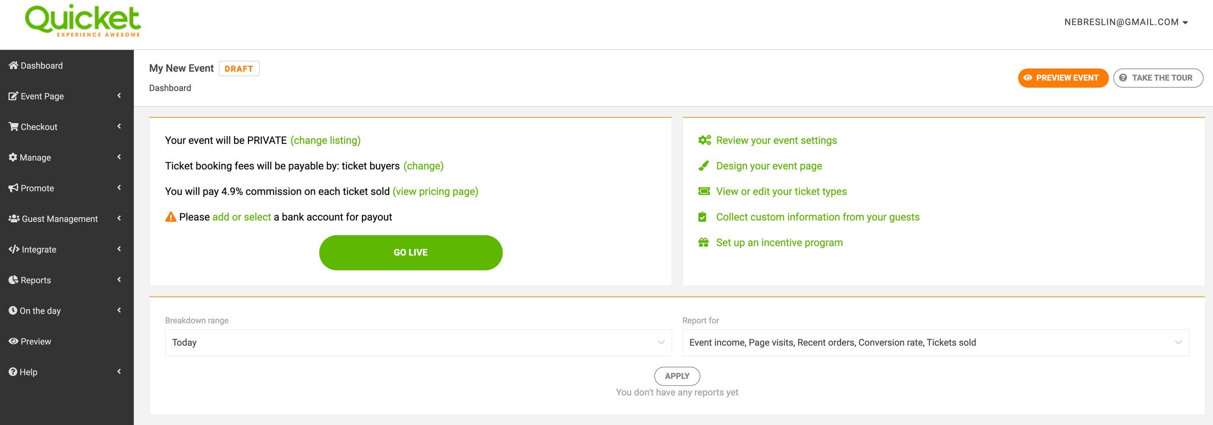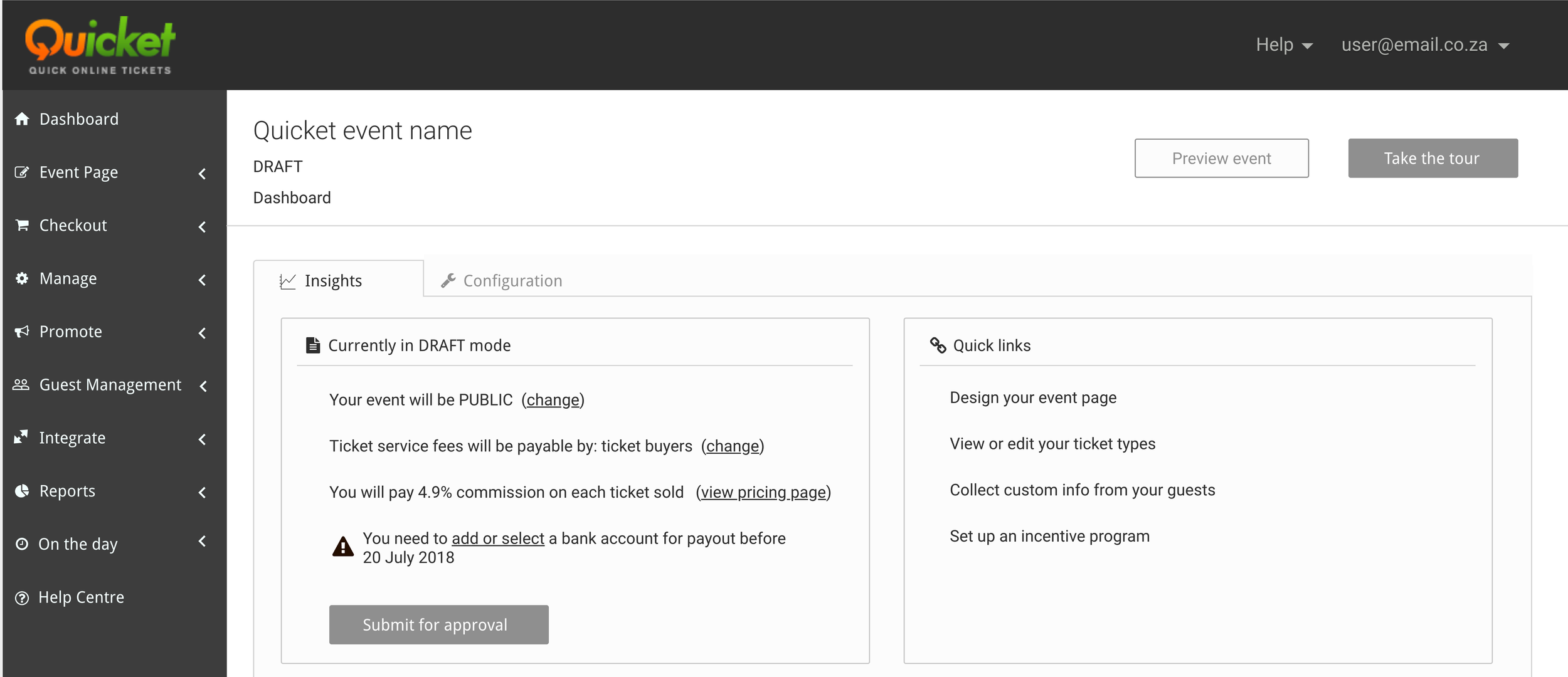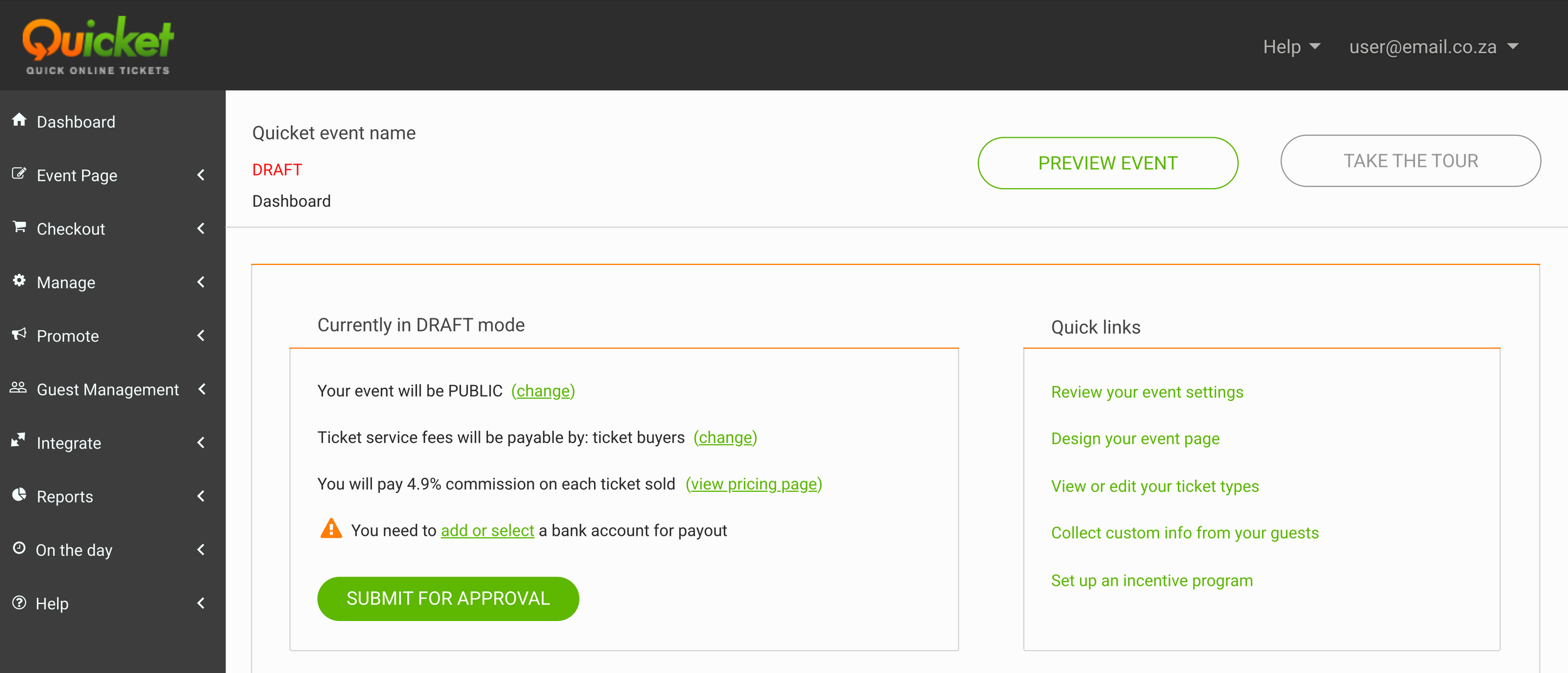 The Quicket event onboarding flow, or event creation process, is used by event organizers to set up a public or private event page to sell tickets on Quicket. When an organizer completes the event creation process, they land on the dashboard homepage where they'll find more options to manage their event.